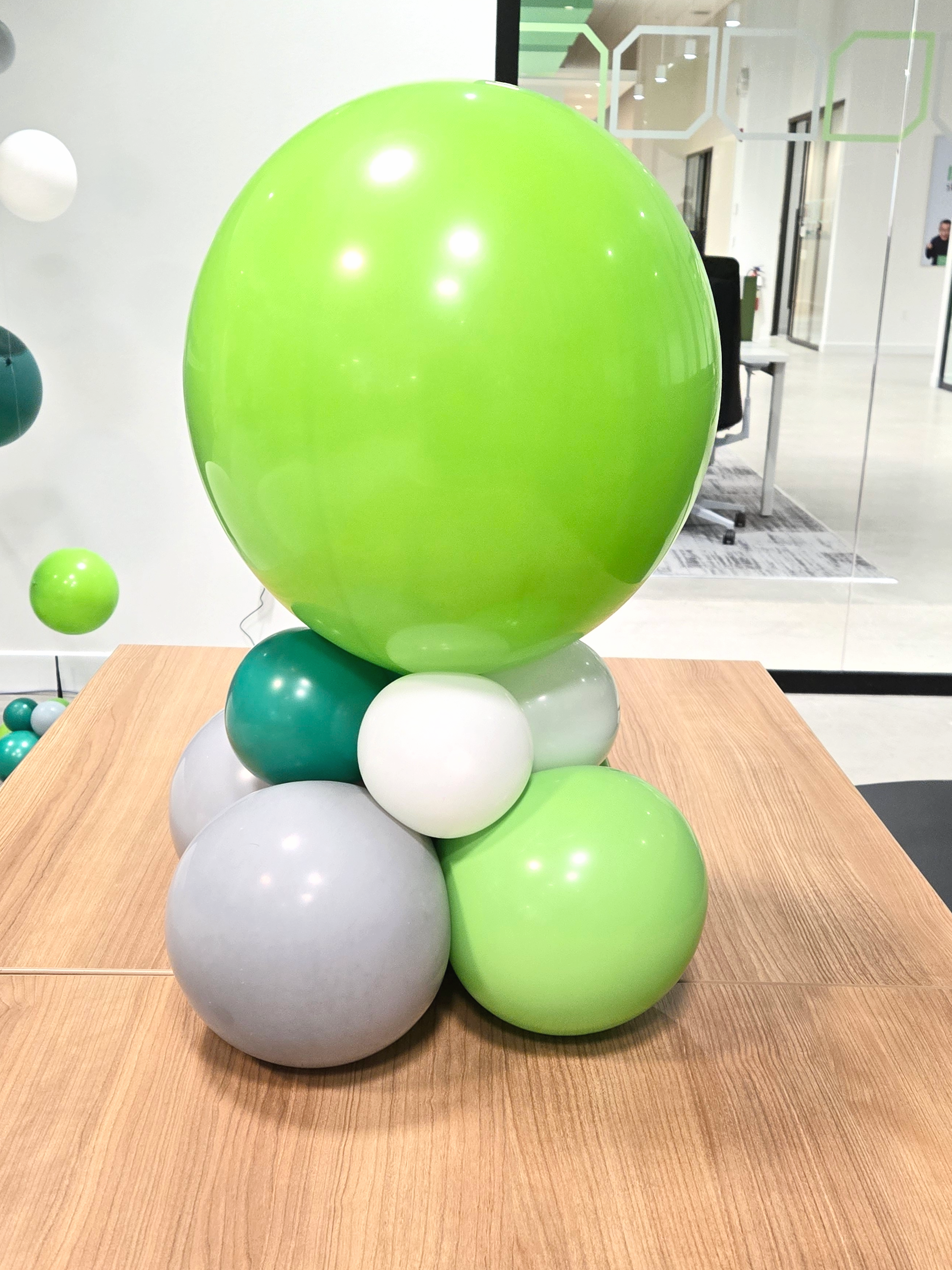 This modern balloon table centerpiece features a custom balloon elegantly arranged on a base of coordinating balloons, creating a clean and eye-catching design. Perfect for corporate events, brand activations, birthdays, and celebrations, this piece adds height and impact without overwhelming the table.